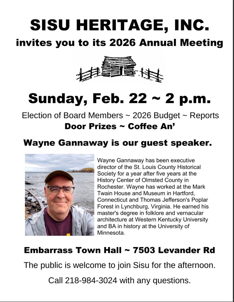 invites you to come to the Sisu Annual Meeting at the Embarrass Town Hall: